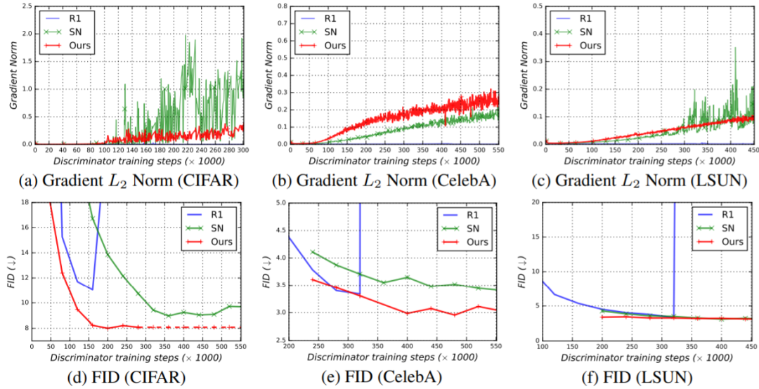 可以看到,新提出方法的表现与使用 R1 惩罚项和谱范数的两个纯净版 ViT 判别器基准相当。其余架构对所有方法来说都一样。可见新方法能克服梯度幅度的尖峰并实现显著更低的 FID(在 CIFAR 和 CelebA 上)或相近的 FID(在 LSUN 上)。