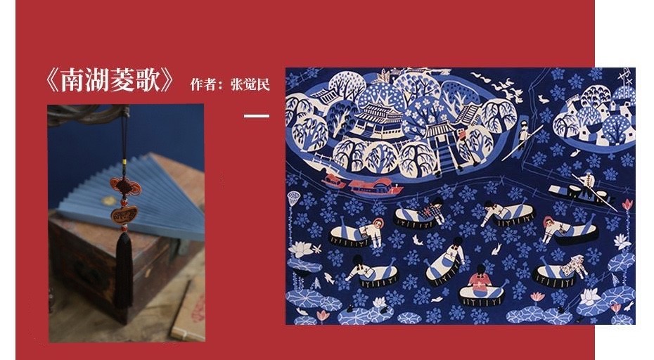 此款图案出自于张觉民老师的《南湖菱歌》,作品吸收了嘉兴民间蓝印花布的色彩和花纹,用民间剪纸的形式,勾画了南湖烟雨楼和采菱图,描绘了党的诞生地—嘉兴南湖儿女在党的领导下励精图治,勤快劳作,幸福生活的美好景象。