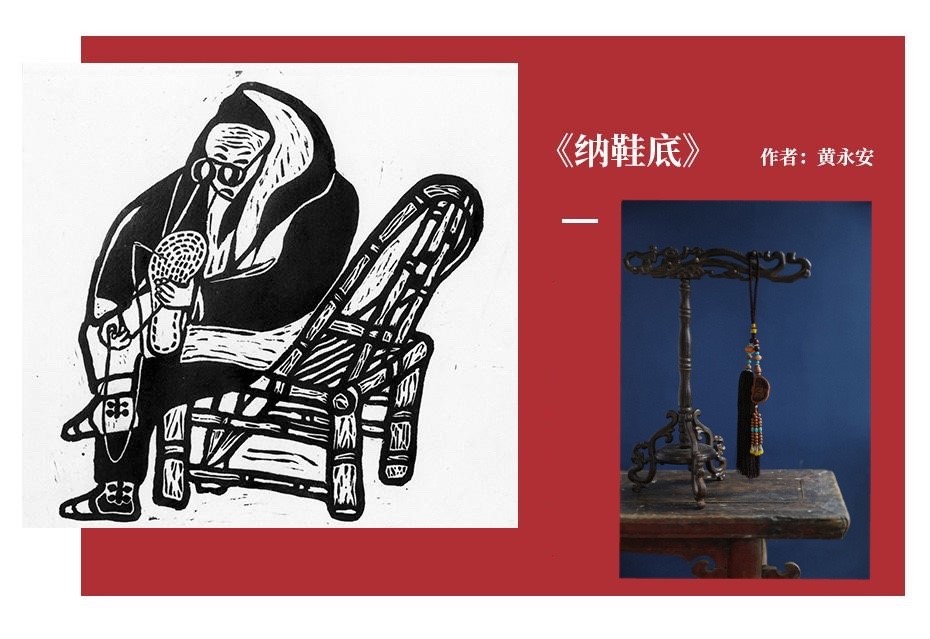 此幅画作《纳鞋底》由黄永安老师创作,作品描绘了一位老人坐在竹椅上,带着老花镜正在一针一线地缝着鞋底。画面简介明了,由一位老人,一把竹椅构成,这也不禁让我们想起家中慈祥的长辈们。