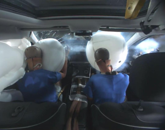 功能表现方面:碰撞后,非碰撞车门均可顺利打开(车门实现了自动解锁功能),被撞侧车门关闭;前排主副驾气囊、撞击侧的侧面气囊与侧气帘均正常展开;人头部接触位置为气囊充气区域;过程中安全带有效实现预张紧,碰撞后座椅和安全带未均发生失效。