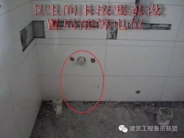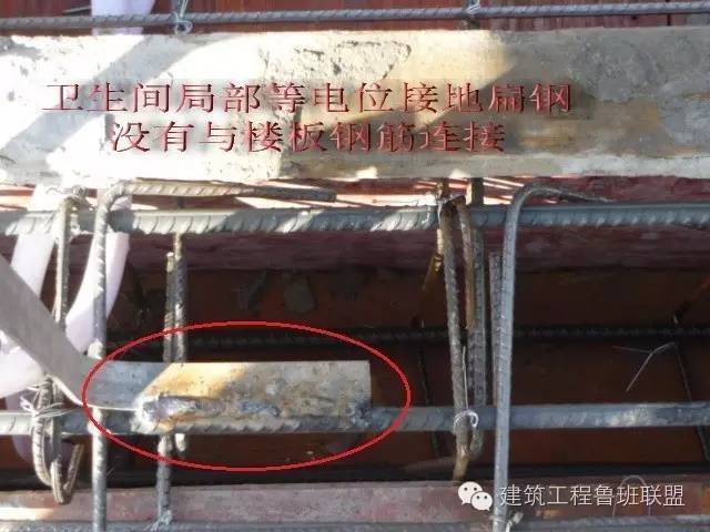①卫生间局部等电位没有按照设计大样图和规范要求与楼板钢筋网连接。
