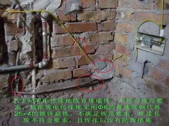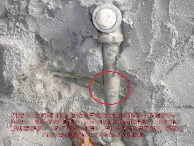 ①卫生间等电位的接地线与金属给水管道连接没有采用专用的接地卡子,而是直接绑扎在金属管道上,并且多股接地线连接前没有搪锡。