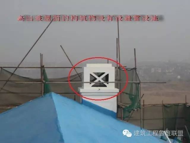 标高高出坡屋面的构筑物(如图示亭子和烟道)没有设避雷引下线和避雷设施。