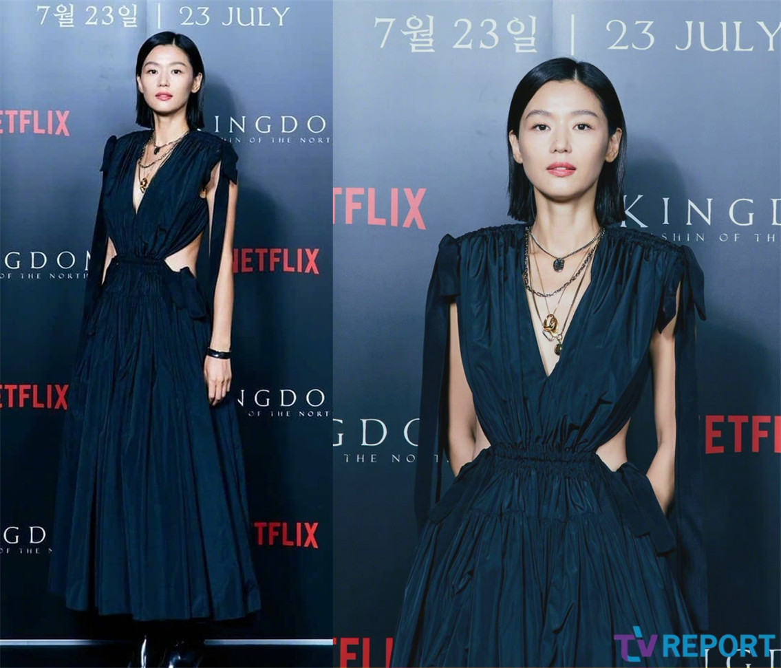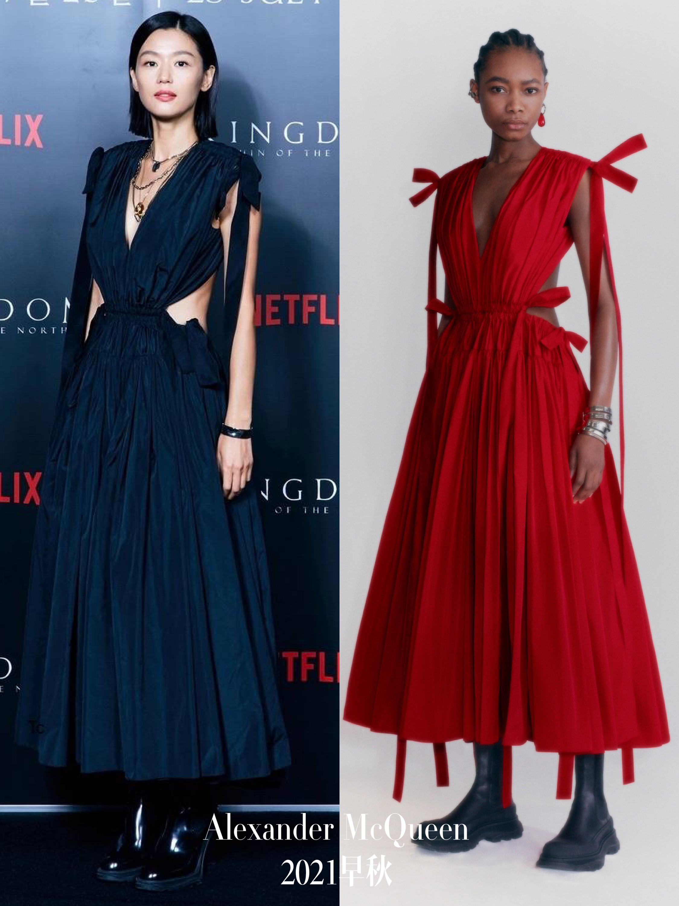 日前,全智贤身穿暗黑风长裙出席《王国:阿信传》发布会,这件麦昆的裙子裙长到脚踝,下半身的大裙摆看起来也比较厚重,加上一双黑色漆皮靴,整体很沉重,好在全智贤身材够高挑,骨架和气场都够大,搭配利落的发型,整体还挺飒的。