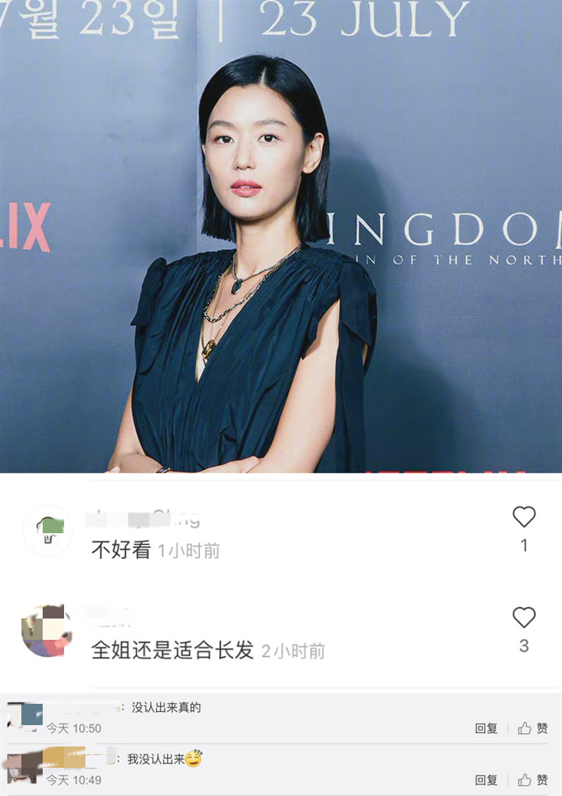 观众的眼睛是雪亮的,单看怼脸照,剪了这个流行的一刀切短发之后,全智贤的美人感反而减弱了,还显得五官寡淡,一句话概括就是这个短发“扬短避长”了。