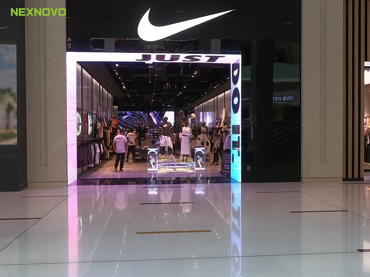 入口处镶嵌定制的光电玻璃上,播放着环绕式的广告标语“JUST DO IT!”紧随着游客的步伐而振动变化,诱人深入探索。又因其具有的高清、高亮的显示特性,即使在白天也能给人以充满未来时代感的视觉体验,绝对是球鞋玩家必须要去打卡的圣地!
