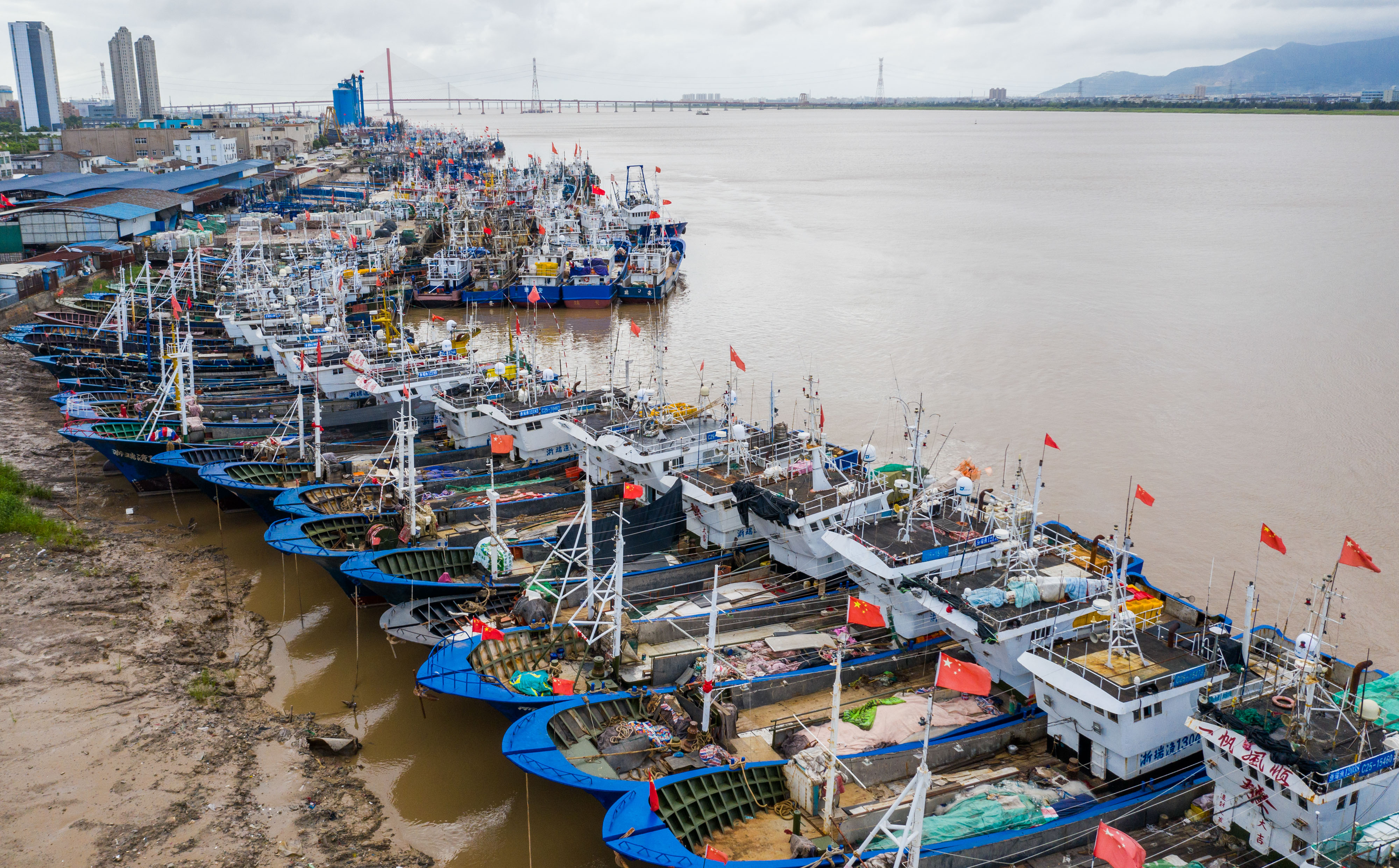 7月20日,在浙江省瑞安市东山渔港码头,700多艘渔船停靠在渔港码头避风,渔民用绳索加固船只。今年第6号台风“烟花”预计于25日凌晨到上午在浙闽沿海登陆。瑞安市于7月19日16时 启动防台风IV级应急响应,做好当前台风防御工作。