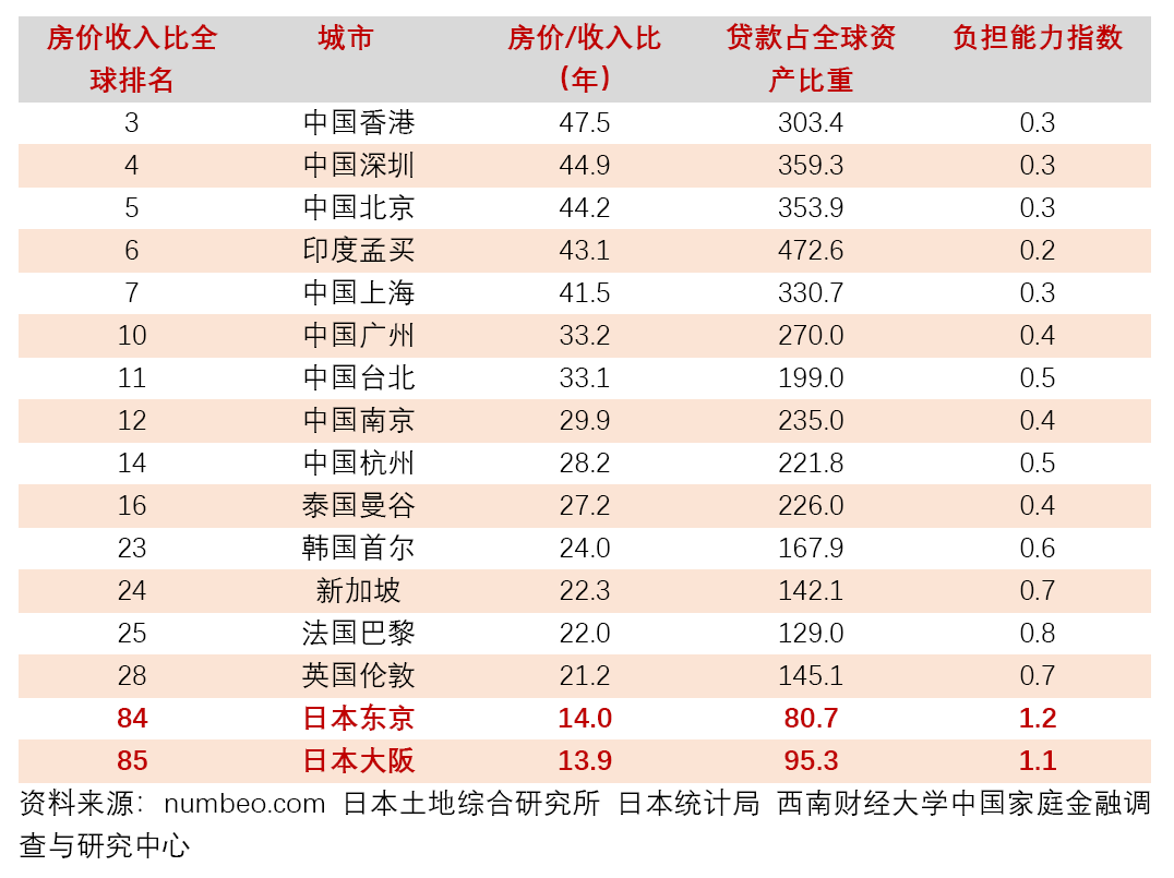 2、贷款占日本家庭资产的比重远低于世界其他大城市