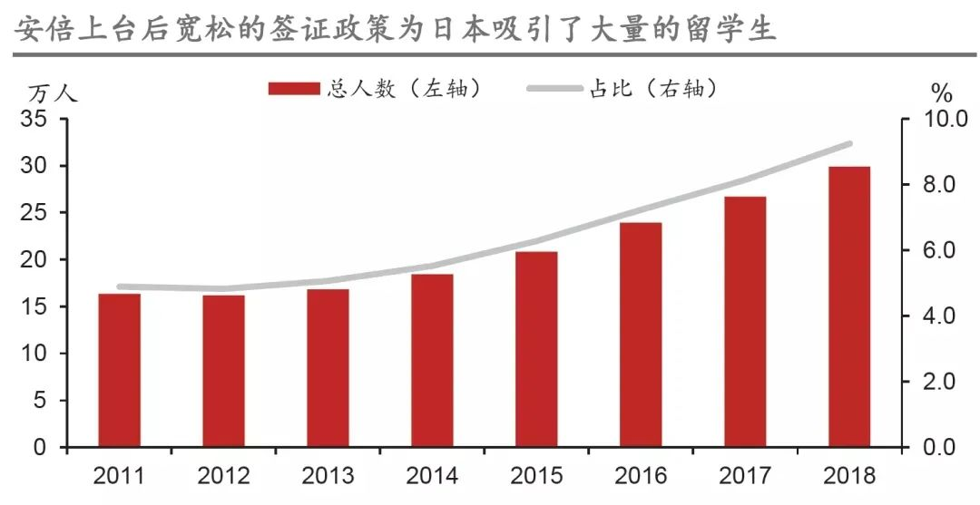 2018年在日留学生总数达30万人,占日本高等教育总人数的近10%,应届生毕业后取得工作签证的人数也直线上升。