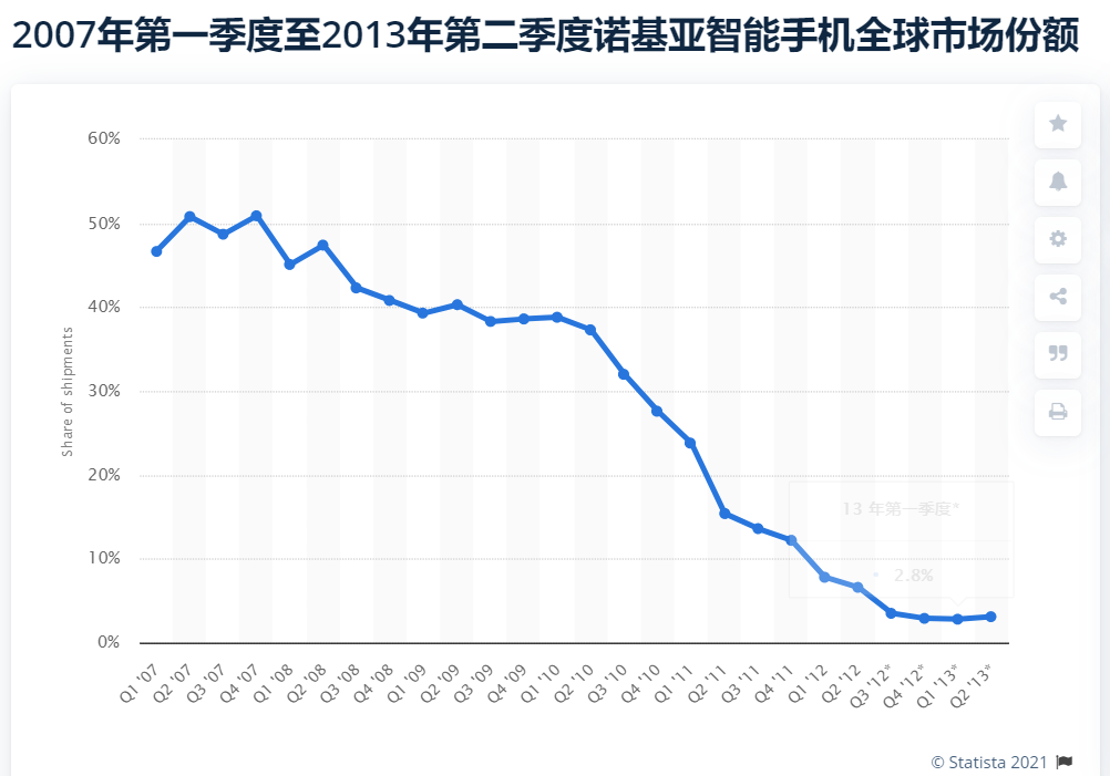 与此同时,因易碎、无键盘而被诺基亚瞧不上的苹果手机销量猛增330%,三星、HTC、LG、摩托罗拉等手机厂商放弃塞班系统,投奔成立不久的安卓(Android)手机阵营。2009年成为诺基亚手机的分水岭,此后几年,诺基亚手机份额如“自由落体”般下坠。