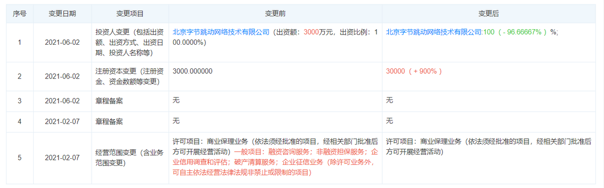 此外,今年6月初,海南字跳商业保理有限公司注册资本从3000万变更为3亿元,增幅900%。海南字跳商业保理有限公司成立于2021年1月,法定代表人为李英,经营范围为商业保理业务。股权信息显示,该公司由字节跳动(香港)有限公司全资子公司北京字节跳动网络技术有限公司全资持股。实际上,今年1月初,海南字跳商业保理成立时就引发行业关注,被解读为是字节跳动有意进军产业链金融,扩大金融生态圈的信号。