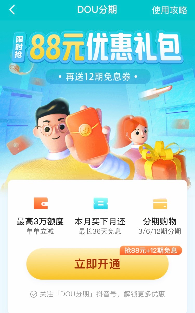此外,记者在抖音APP—“我的”—“钱包”栏目里看到了另一款借贷产品“Dou分期”以及抖音支付的推广信息。官方介绍信息显示,“Dou分期”是抖音为符合要求的客户提供的“先消费,后付款”的在线消费金融服务,大致对标的是蚂蚁集团的“花呗”。页面信息展示,“Dou分期”额度最高为1万元,最长可享受36日免息期,并支持3/6/12期还款。新用户开通“Dou分期”还可获得88元优惠礼包,活动力度不小。