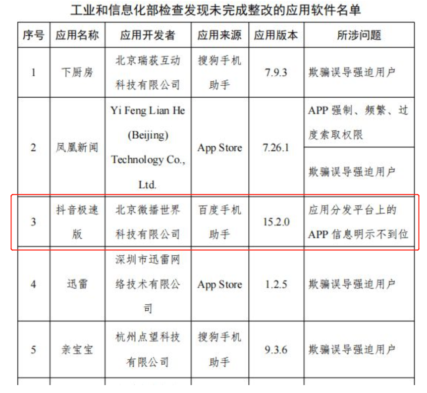 记者注意到,就在7月19日,工信部官网发布的“关于侵害用户权益行为的APP通报”显示,抖音极速版APP涉及应用分发平台上的APP信息明示不到位问题,被要求在7月26日前完成整改落实工作。“逾期不整改的,将依法依规组织开展相关处置工作。”工信部表示。