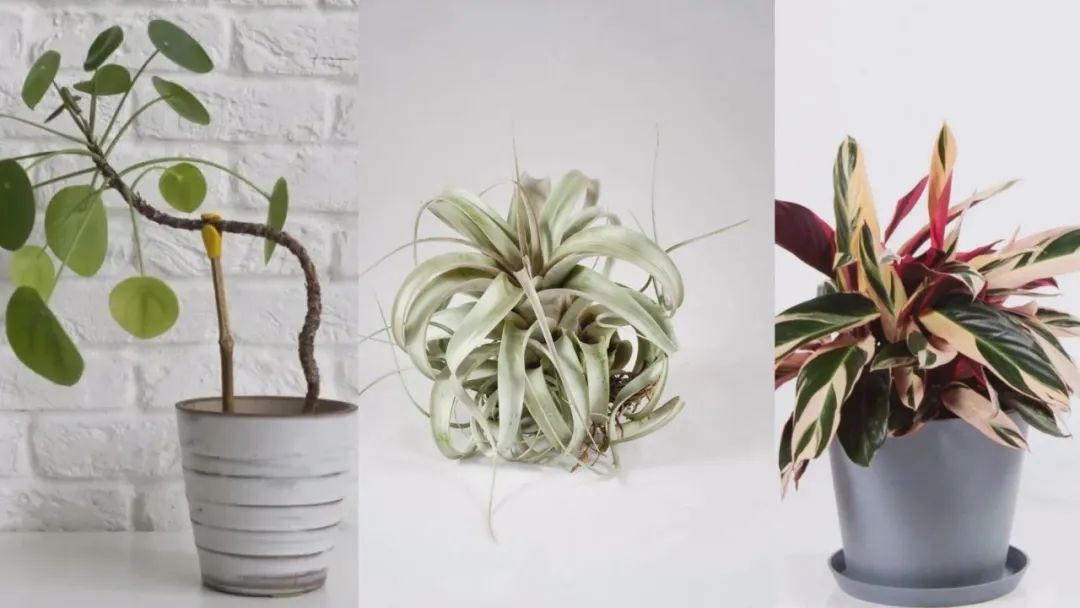 上面分别是镜面草、空气凤梨和七彩竹芋