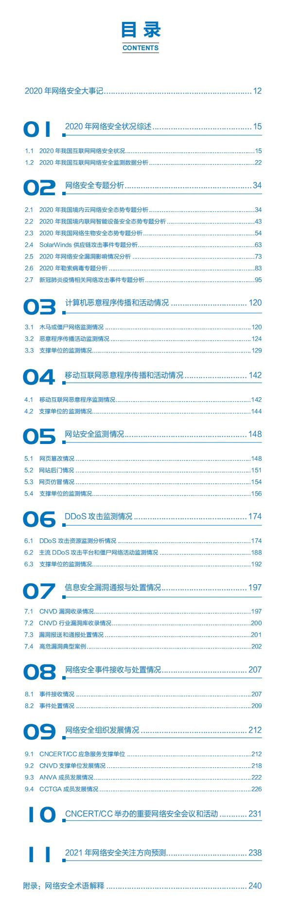 《2020 年中国互联网网络安全报告》 汇总分析了CNCERT/CC 自有网络安全监测数据和 CNCERT/CC 网络安全应急服务支撑单位报送的数据,具有鲜明的行业特色和重要的参考价值,内容涵盖我国互联网网络安全态势分析、网络安全监测数据分析、网络安全事件案例详解、网络安全政策和技术动态等多个方面。其中,本报告对计算机恶意程序传播和活动、移动互联网恶意程序传播和活动、网站安全监测、DDoS 攻击监测、信息安全漏洞通报与处置、网络安全事件接收与处置等情况进行深入细致的分析,并对 2020 年的典型网络安全事件进行专题介绍。此外,本报告还对网络安全组织发展情况和 CNCERT/CC举办的重要网络安全会议和活动等进行了阶段性总结。最后,本报告对 2021 年网络安全关注方向进行预测。