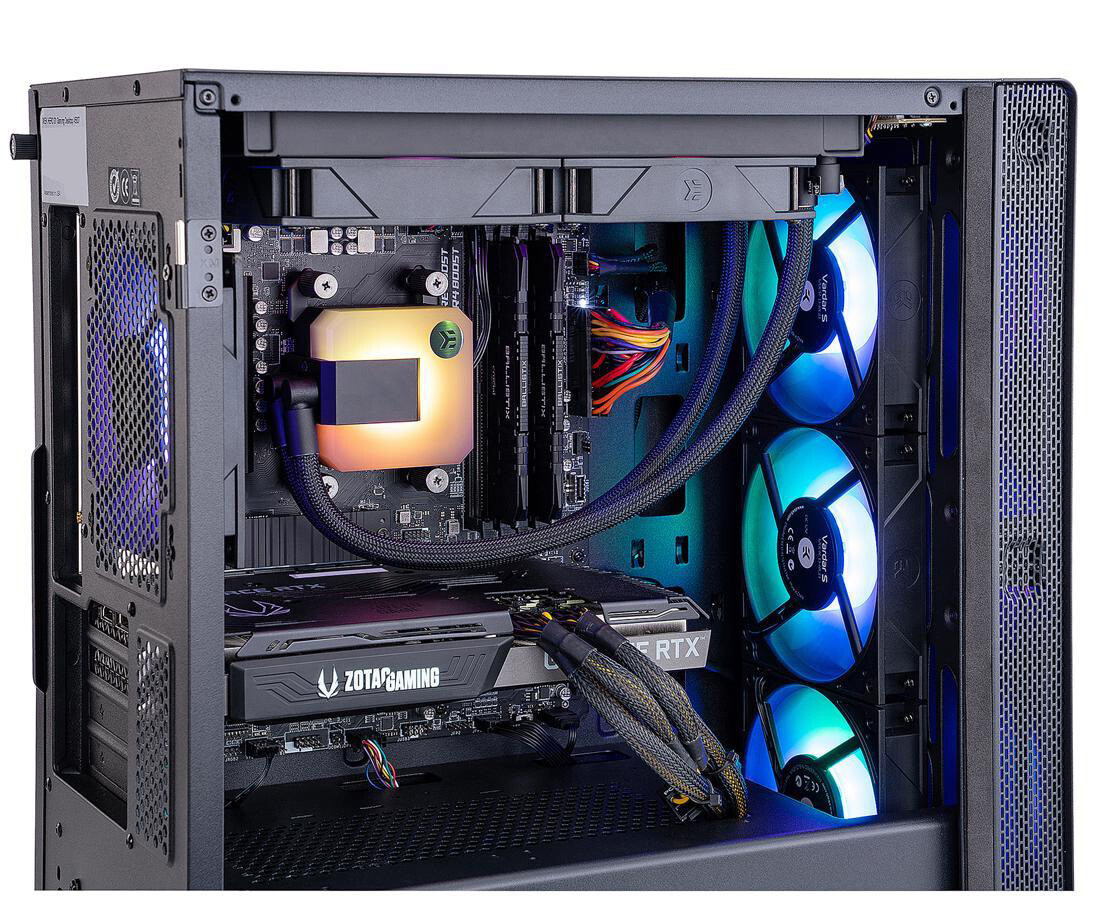 官方表示,此款主机适用于 FPS 游戏乃至 3A 大作,具有良好的兼容性和稳定性。散热方面与 EK 公司进行合作,采用 EK AIO 240D-RGB 一体式 CPU 水冷散热器,采用 240mm 规格水冷排。