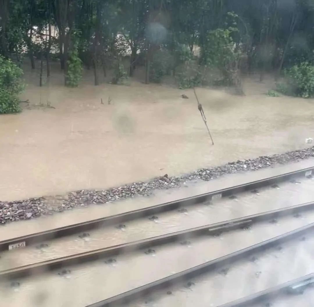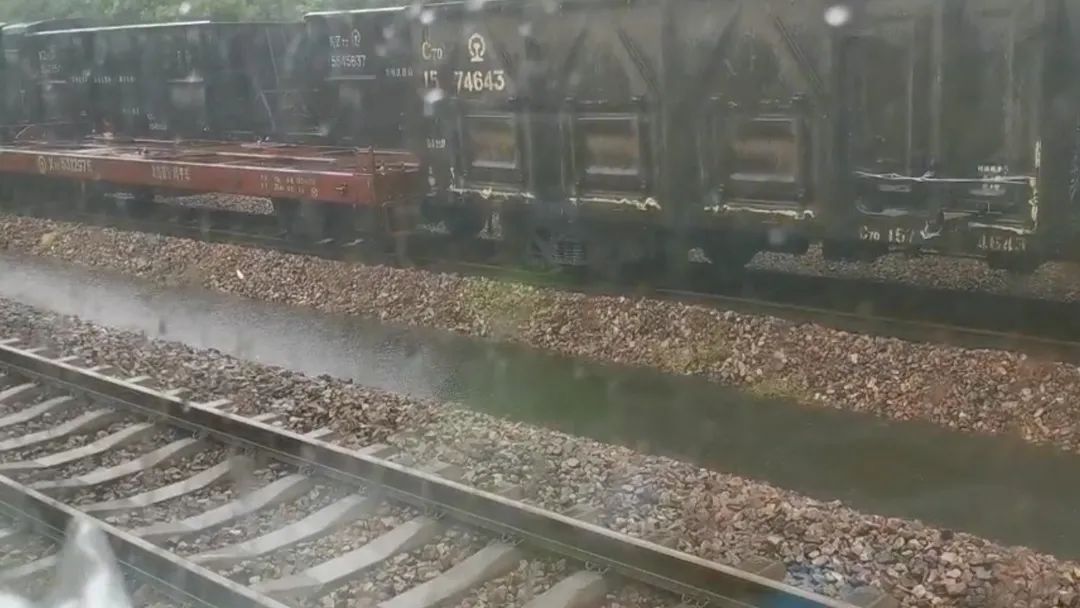 轨道边有一片树林,李裕龙看到积水一直在涨,快把铁轨淹没了。当时,他有些紧张,害怕水会一直涨,淹没列车。同时,他也在等待,积水慢慢下降,列车会再次开动。但即使看到积水缓缓下降,身穿橙色雨衣的铁道抢修人员重新出现在视野后,列车仍未开动。