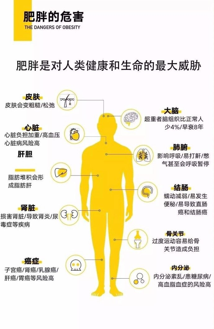 如果您目前体重处于超重或肥胖范畴,请您务必引起重视。肥胖是导致2型糖尿病、高血压、心血管疾病和高血脂症的危险因素。下图形象地说明了肥胖的危害。