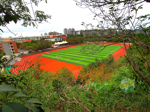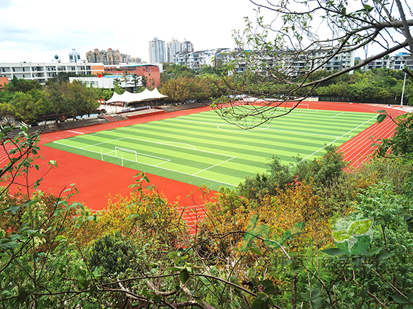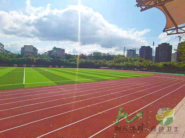 13mm透气型塑胶跑道底层用单组份胶水混合环保打底颗粒,人工或机械压实摊铺而成,面层用聚氨酯跑道面胶混合EPDM颗粒后在底层基础上喷涂而成。