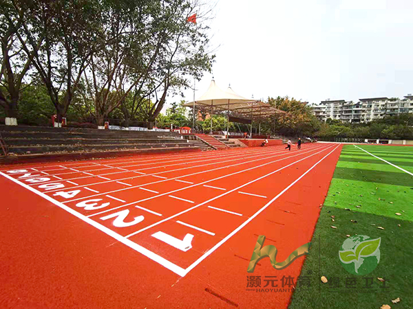 跑道喷线:按照现行的田径场地设施标准准确测量出工艺线的位置,然后用专用划线漆喷画。