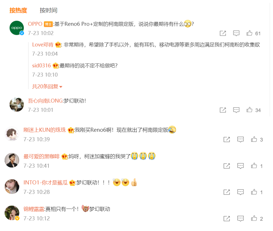 7月23日,OPPO在微博官宣,将会推出Reno6 Pro+柯南限定版手机,而且将会在下周一正式跟广大柯南粉见面,到底是预热的开始还是直接发布呢?这还有待确认。也许是惊喜和幸福感来得太突然,这瞬间就引起了诸多粉丝的热议,很多网友也表示:我现在都想预定了,这真的是梦幻般的合作啊!也有人说:我的青春要回来了。网友的反应确实也是眼前一亮,动漫柯南系列无论国内还是全球范围都拥有众多沉迷爱好者,与此IP合作定制的的手机或是一种精神承载与回忆,颇具纪念意义。