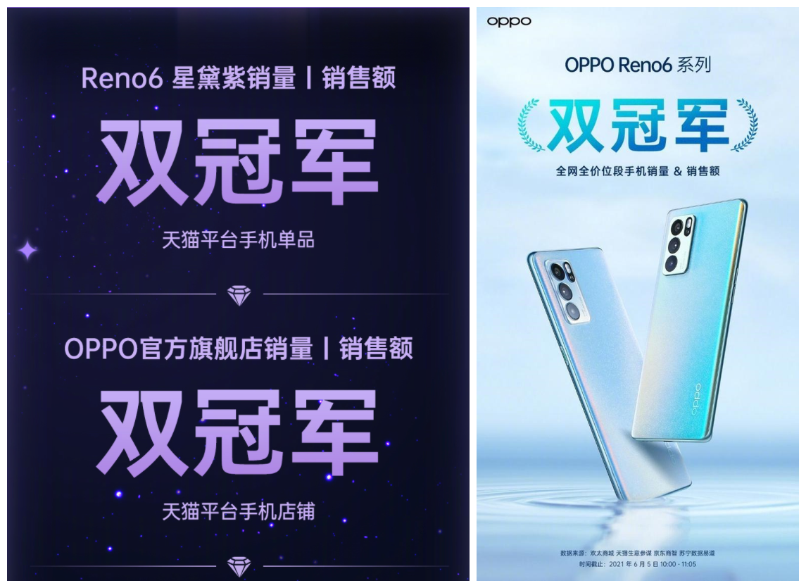 上半年诞生非常多的优秀旗舰手机,而很多手机用户都相信“颜值即正义”,颜值高性能强的机型往往特别受青睐。比如OPPO前段时间发布的Reno6系列就十分热门,在首销之日便打破了Reno机型发布以来的各种销售记录,而且OPPO Reno6系列首次拿下苏宁易购月度手机销量冠军,近期推出的星黛紫新配色首销日也获得天猫平台销量&销售额双冠军,打破了OPPO历代新配色机型的全天销量纪录,可谓是相当火爆。