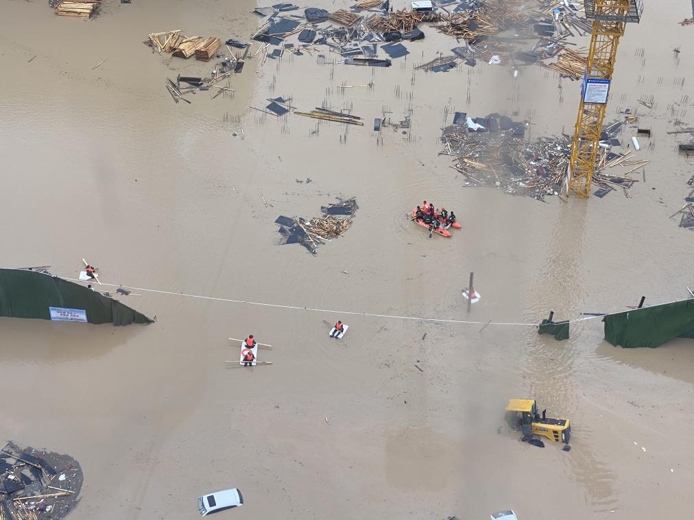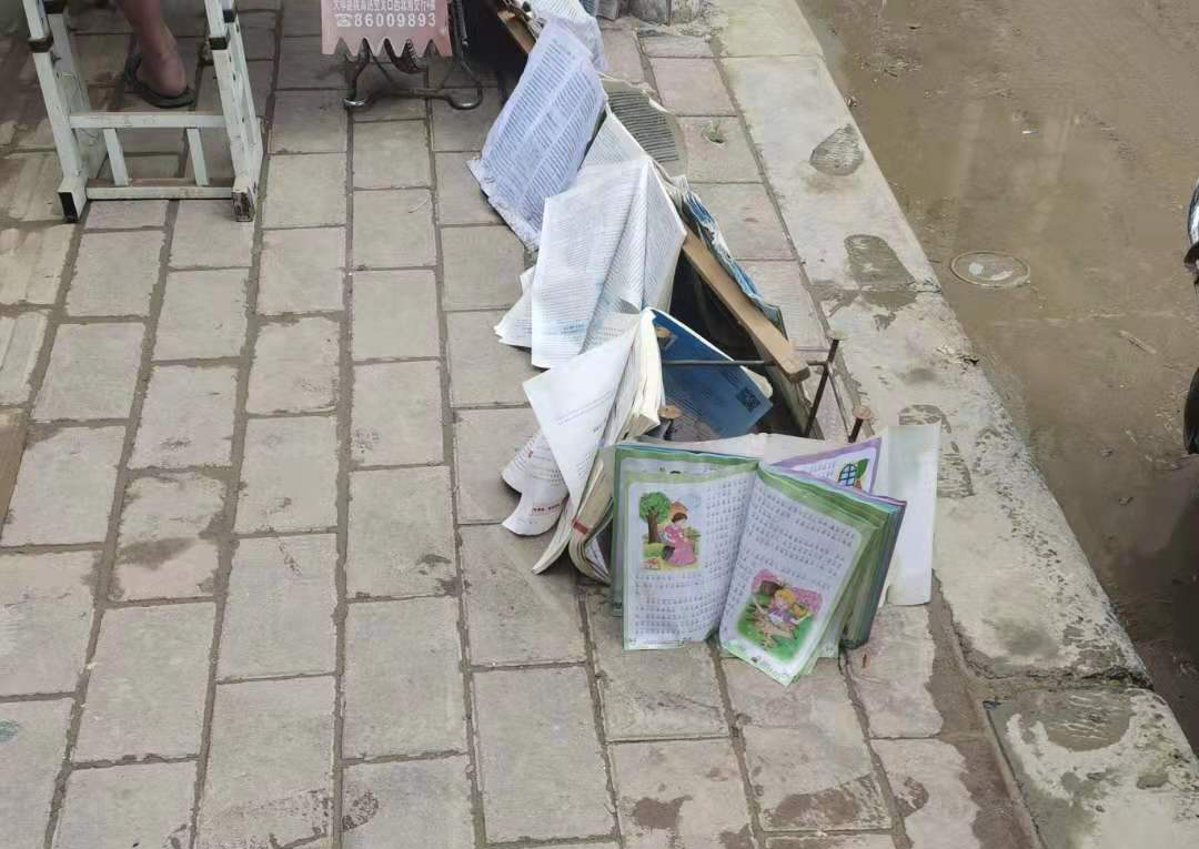 后来听社区的大妈大爷说,志愿者开着铲车载了8个人,开到工地附近,那一块塌方了。铁皮门直接冲到了地基里,那下面是空的。水太深,志愿者划着小皮艇,转悠两天了,不知道人有没有全部救上来。