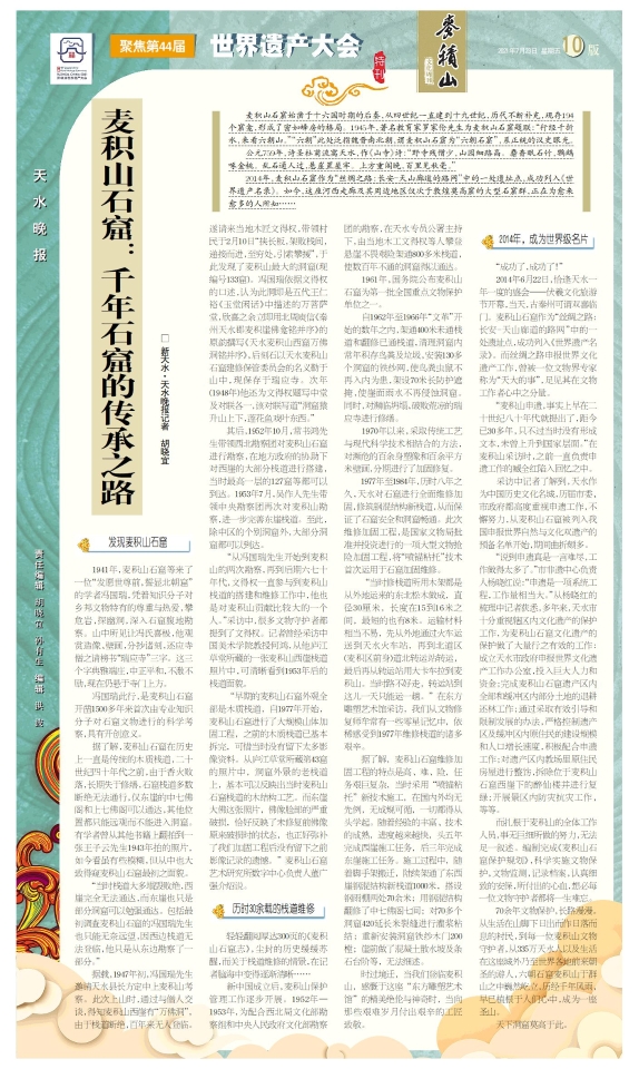 2014年6月22日,恰逢天水一年一度的盛会——伏羲文化旅游节开幕,当天,古秦州可谓双喜临门。麦积山石窟作为“丝绸之路:长安-天山廊道的路网”中的一处遗址点,成功列入《世界遗产名录》。而丝绸之路申报世界文化遗产工作,曾被一位文物界专家称为“天大的事”,足见其在文物工作者心中之分量。