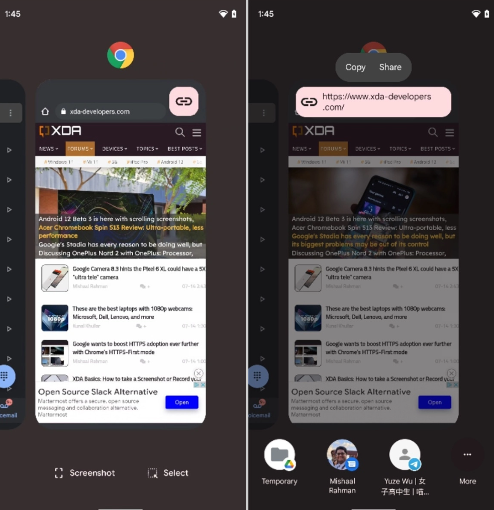 据外媒 XDA,Android 12 最新的 URL 共享功能可让用户快速复制 App 后台卡片中的链接。比如下图中,Chrome 浏览器在右上角拥有一个链接按钮,点击之后即可快速复制当前页面的网址。