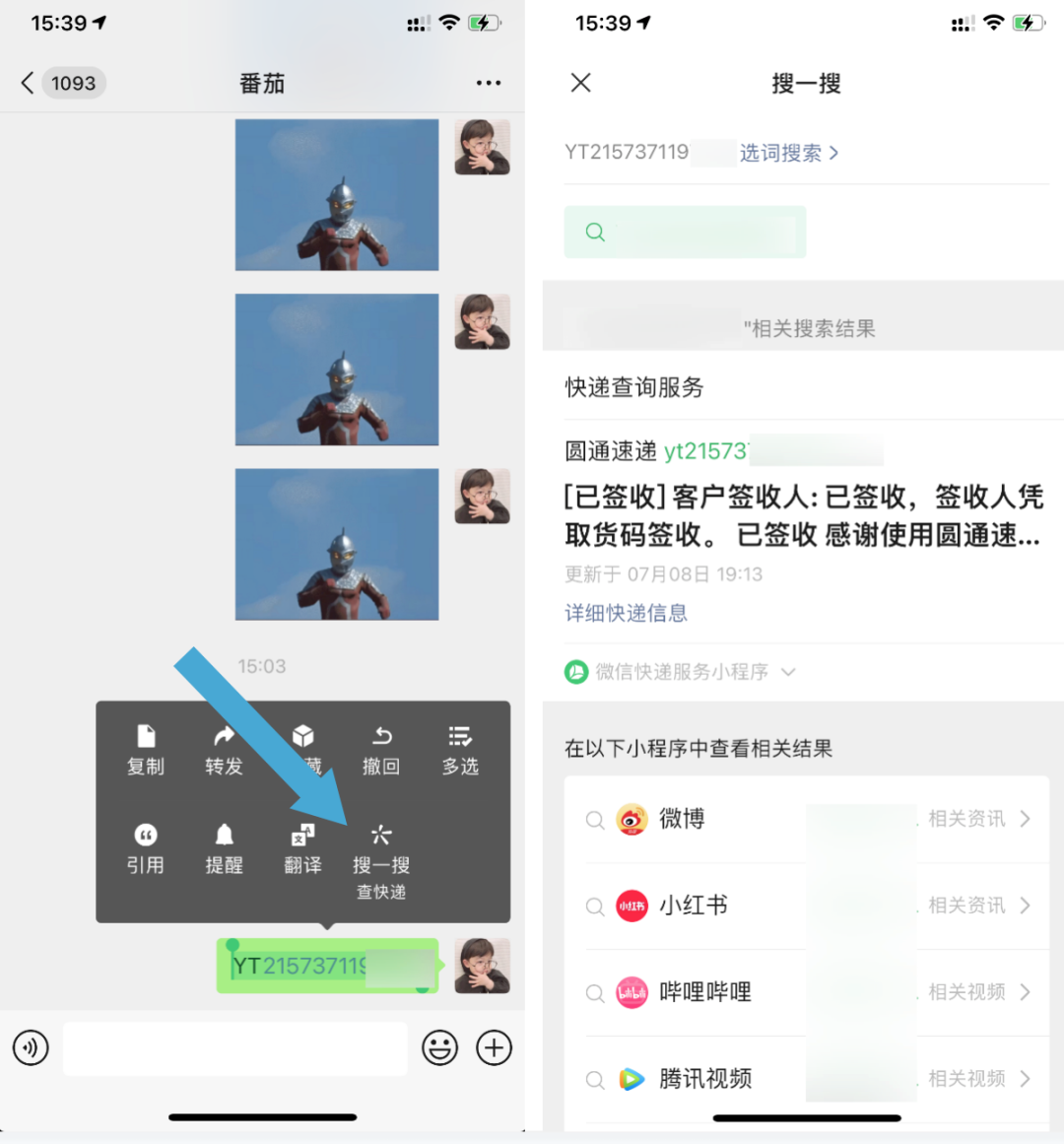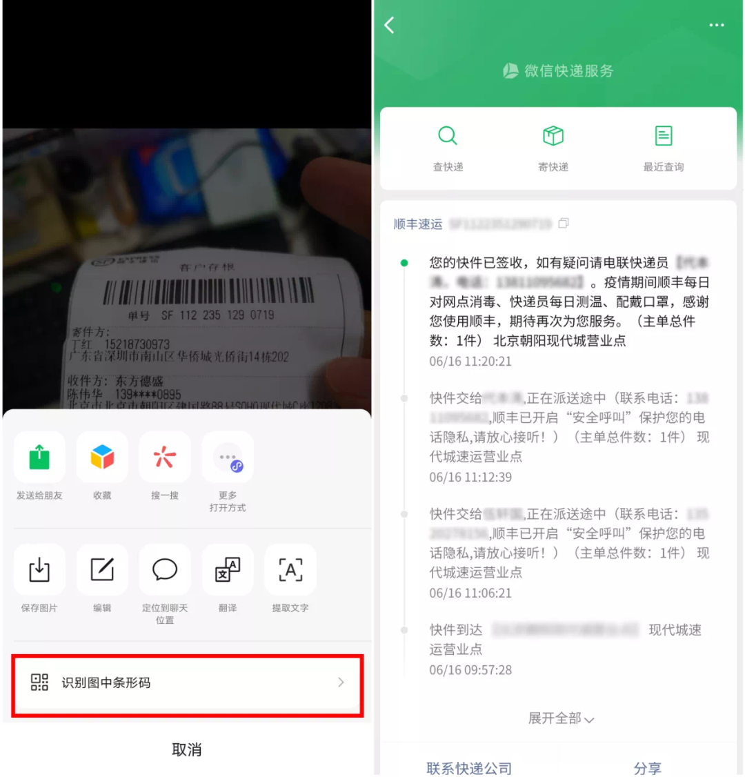 如果你不想打字的话,也可以直接拍下快递回执单图片,在微信中长按并识别,从而快速获取快递信息。