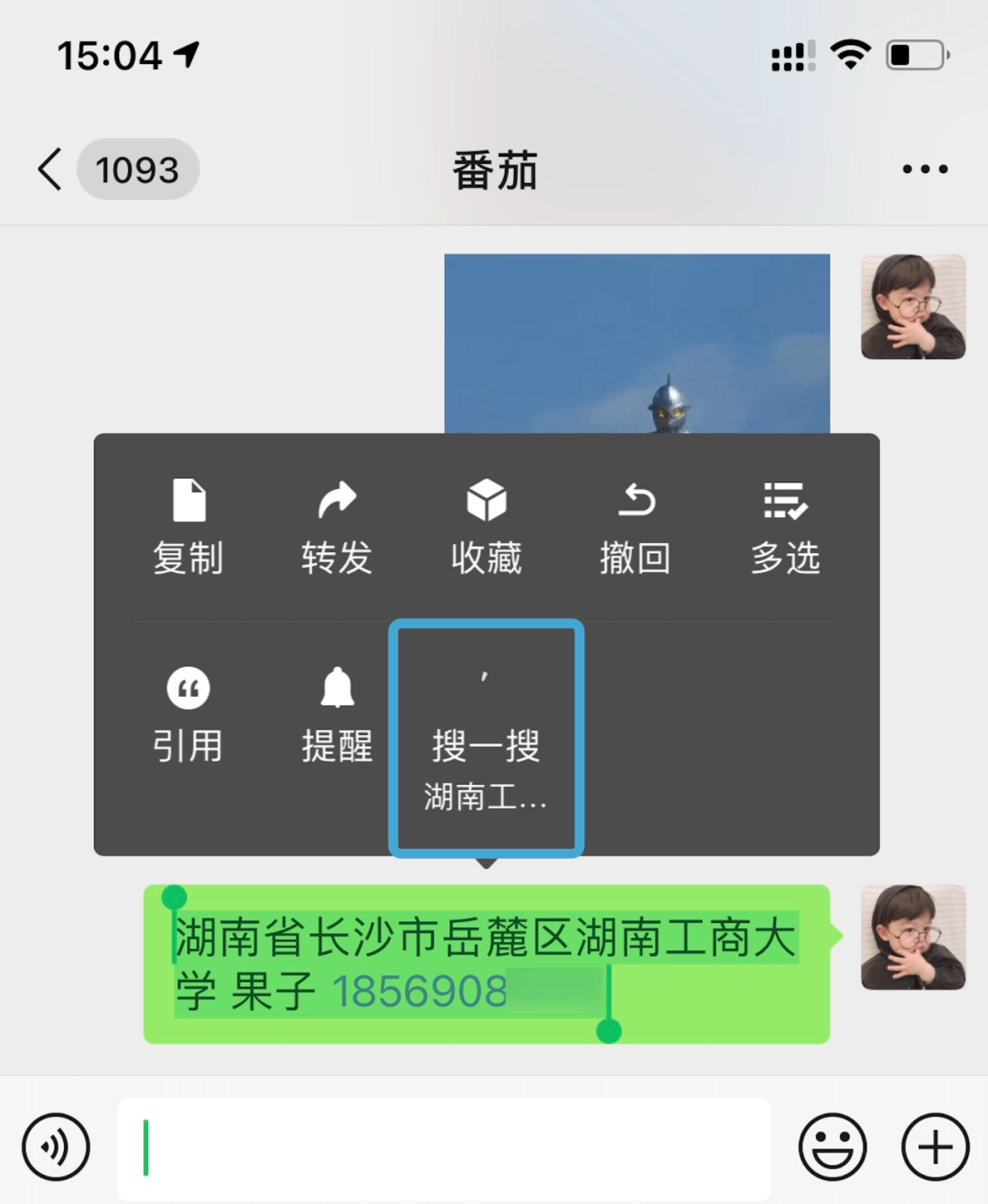 现在微信已经上线了一个非常重要的新功能,就是我们在微信对话框中打出地址电话姓名,就能使用搜一搜快速寄快递。长按聊天中的地址电话姓名,选择搜一搜。