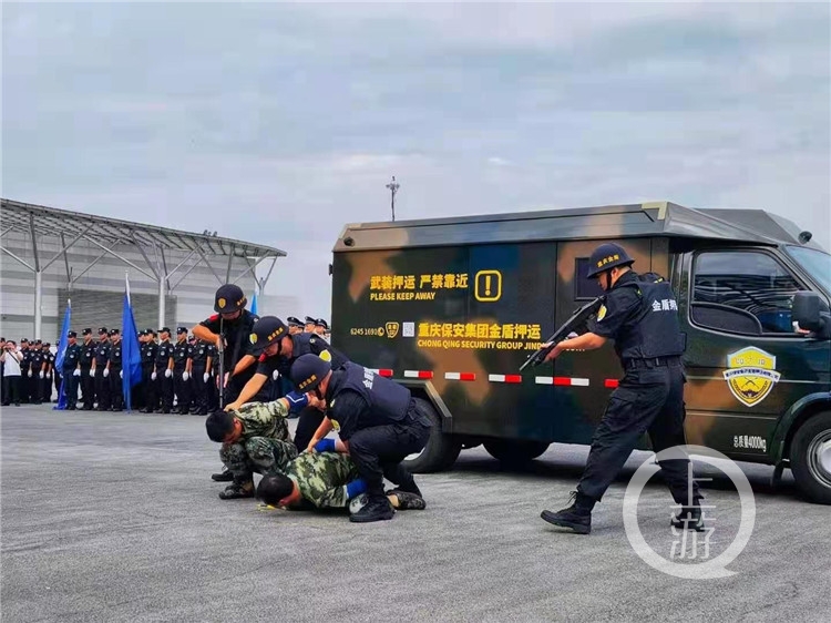 这紧张刺激的场面并不是一场真正的“抢劫”,而是由重庆市公安局主办的“忠诚履职心向党、保安护航新征程”全国保安行业主题宣传日活动(重庆分会场)的保安技能演练环节,这是重庆保安集团金盾押运公司模拟处置突发事件。