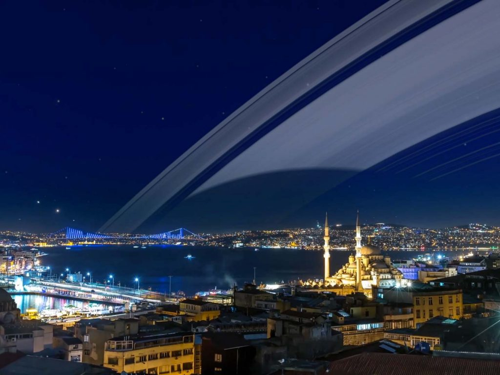 在这里,一颗中等大小的小行星都能越过地球的罗氏极限(这颗小行星距离我们约11000英里),我们可以有一个属于我们自己的宇宙带。的确,大多数中等大小的小行星可能会在我们的宇宙带形成之前撞到地球(众所周知那样会生灵涂炭),但那就是另一回事了。假设地球已经有了环,而所有的人类历史都发生在地球环包围之下。在很多方面,生活还是和现在一样。但是也会有一些显著的不同。
