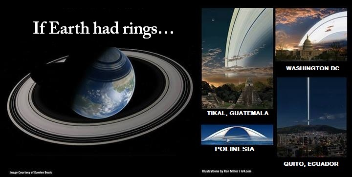 对于在这个星球上的生命来说,蓝天白云是很常见的景象,但是无论何时我们抬头仰望都可以看到古老星球的碎片,天文学家不得不越过碎片去观察宇宙,气象学家需要花费大量时间去监控卫星云图并预测它们的运动情况,经过的岩石和冰会破坏天气系统,使预测产生比现在更大的不确定性。油画、肖像画、照片和自拍照的背景上面都包含有稳定的宇宙尘埃。也许最大的不同在晚上,云层向地球上反射的光线比月球多,因为他们更接近。但在别的方面,我们假设的这个圆圈并不能很大程度的影响潮汐(月球仍然是主要的影响因素),但是他们可以引起我们气候很大的变化。在2004年到2017年间,NASA的探测器花费了13年时间发现土星的电离层——大气中一层带电粒子——在土星环的阴影下温度更低密度更大。