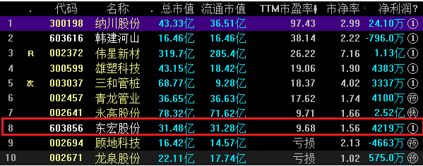 其中估值最低的东宏股份(603856),目前市盈率(TTM)仅有9.68倍!