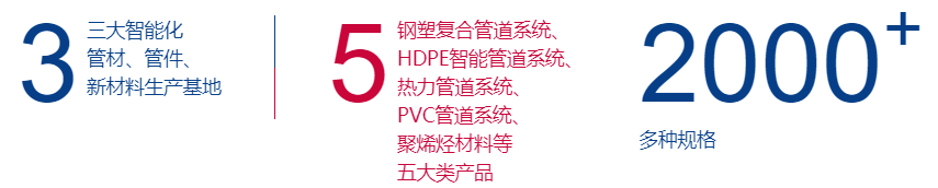 同时,公司还是国内唯一的覆盖塑料管道、复合管道、防腐金属管道的综合性生产企业,拥有全球最大的钢塑复合管道制造基地。
