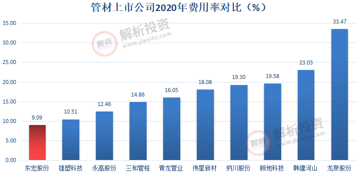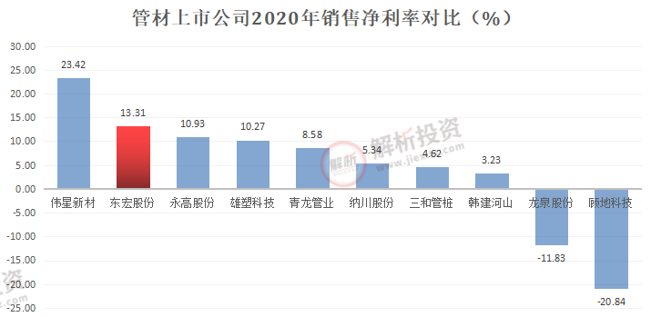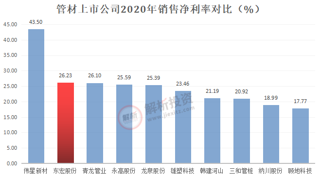因此,东宏股份的销售净利率实现较快提升,2020年为13.31%,同比提升2.36个百分点,仅次于伟星新材。