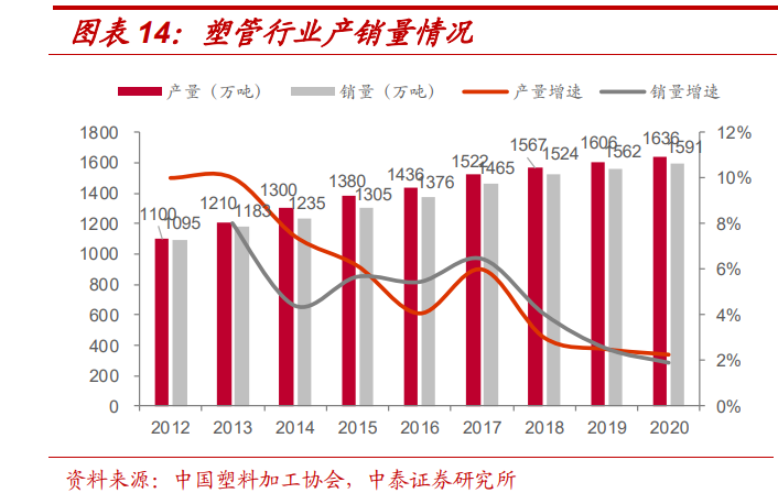以塑料管行业为例,2020年我国塑料管年产量为1636万吨,同比增长2%,2012-2020年CAGR为5.1%,预计2020年行业销售额达到3374亿元,同比增长1.9%。