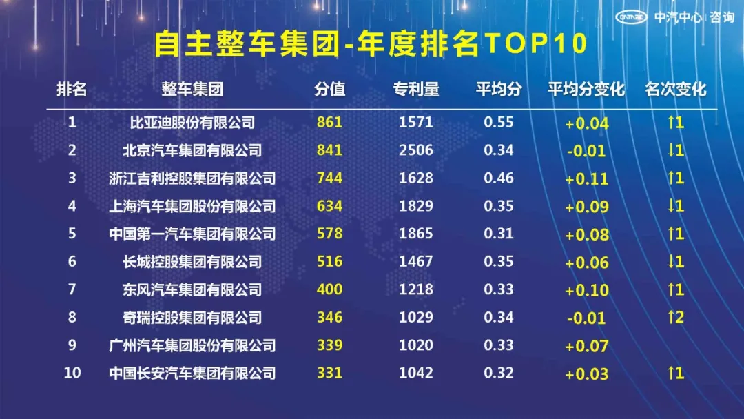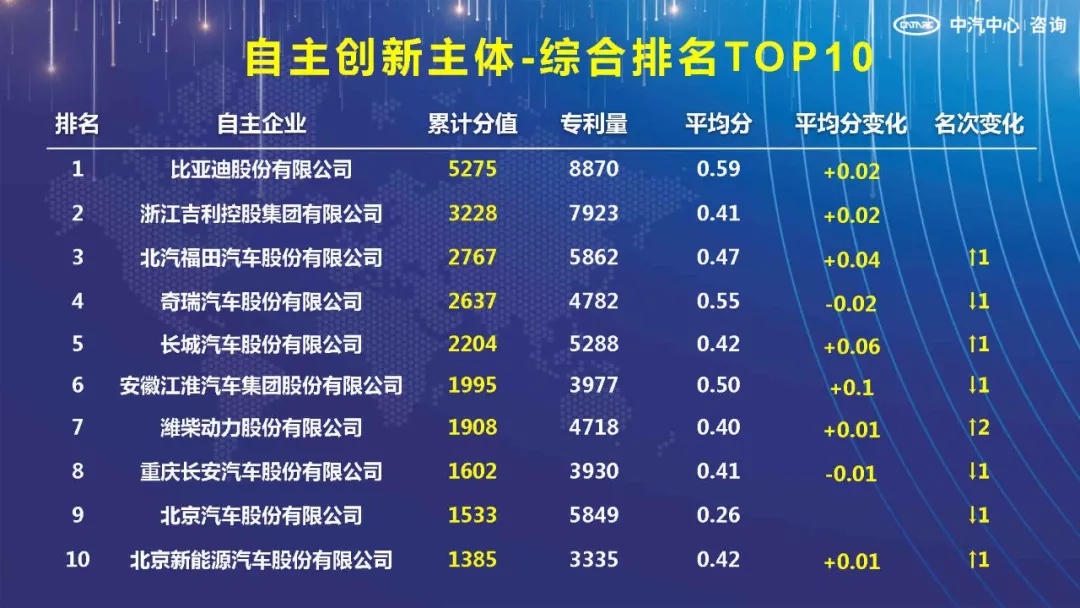 2021年7月23日,以“创新引领未来,科技改变生态”为主题“2021年中国汽车创新大会”在吉林省长春市隆重召开,在会上公布的“自主创新主体”、“自主整车集团”、“新能源汽车”TOP10榜单中,比亚迪分别以5275分、861分、457分排名第一。