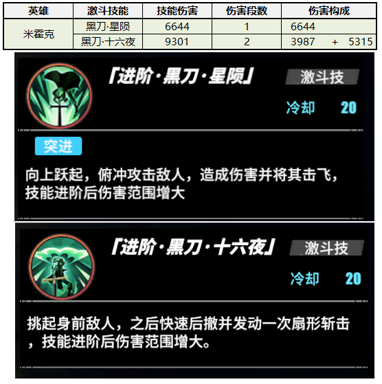在游戏中鹰眼米霍克拥有两个激斗技能,一个是黑刀十六夜,一般我们称之为后撤步,因为这个技能有一个后撤的动作;另一个激斗技是黑刀星陨,一般我们称之为撑杆跳,因为这个技能是一个从起跳到落地的动作,也有叫俯冲的,都一样。