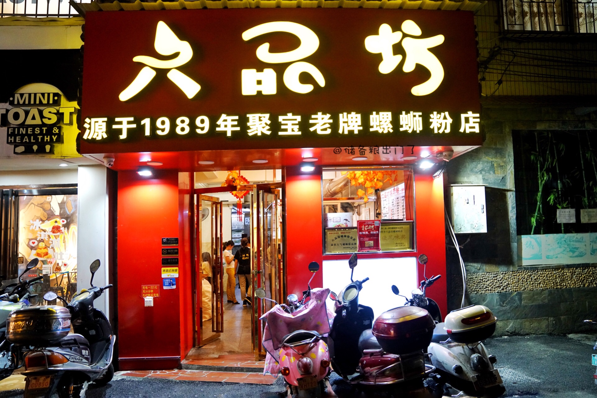看「六品坊螺蛳粉」门口写着“1989年聚宝老牌螺蛳粉”,这么算算是家营业32年的老店啦!看菜单上提供三鲜、原味、伊面、干捞螺蛳粉,没想到一碗粉也能做出这么多花样。