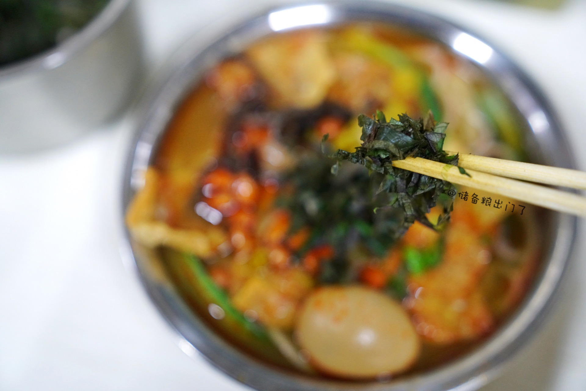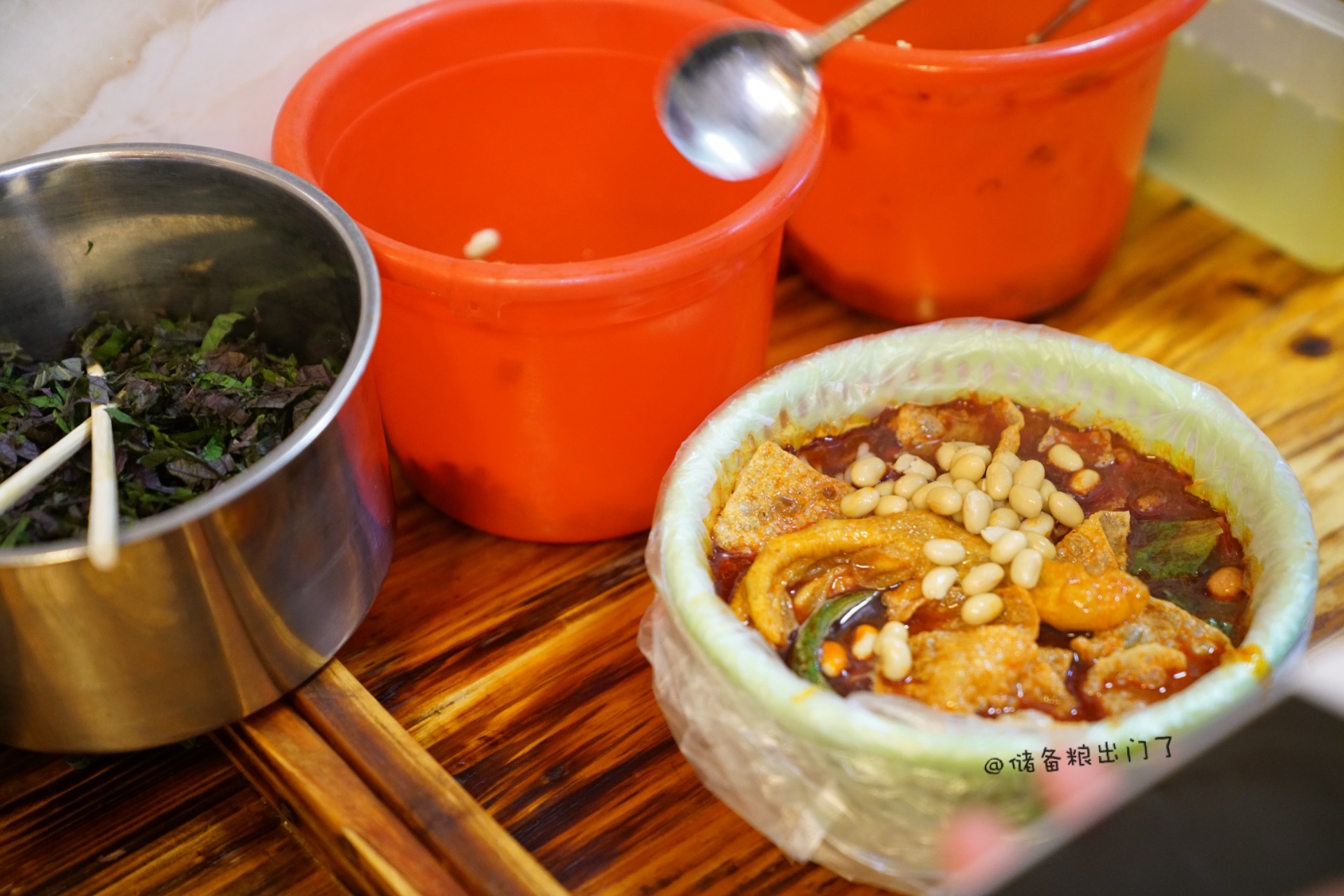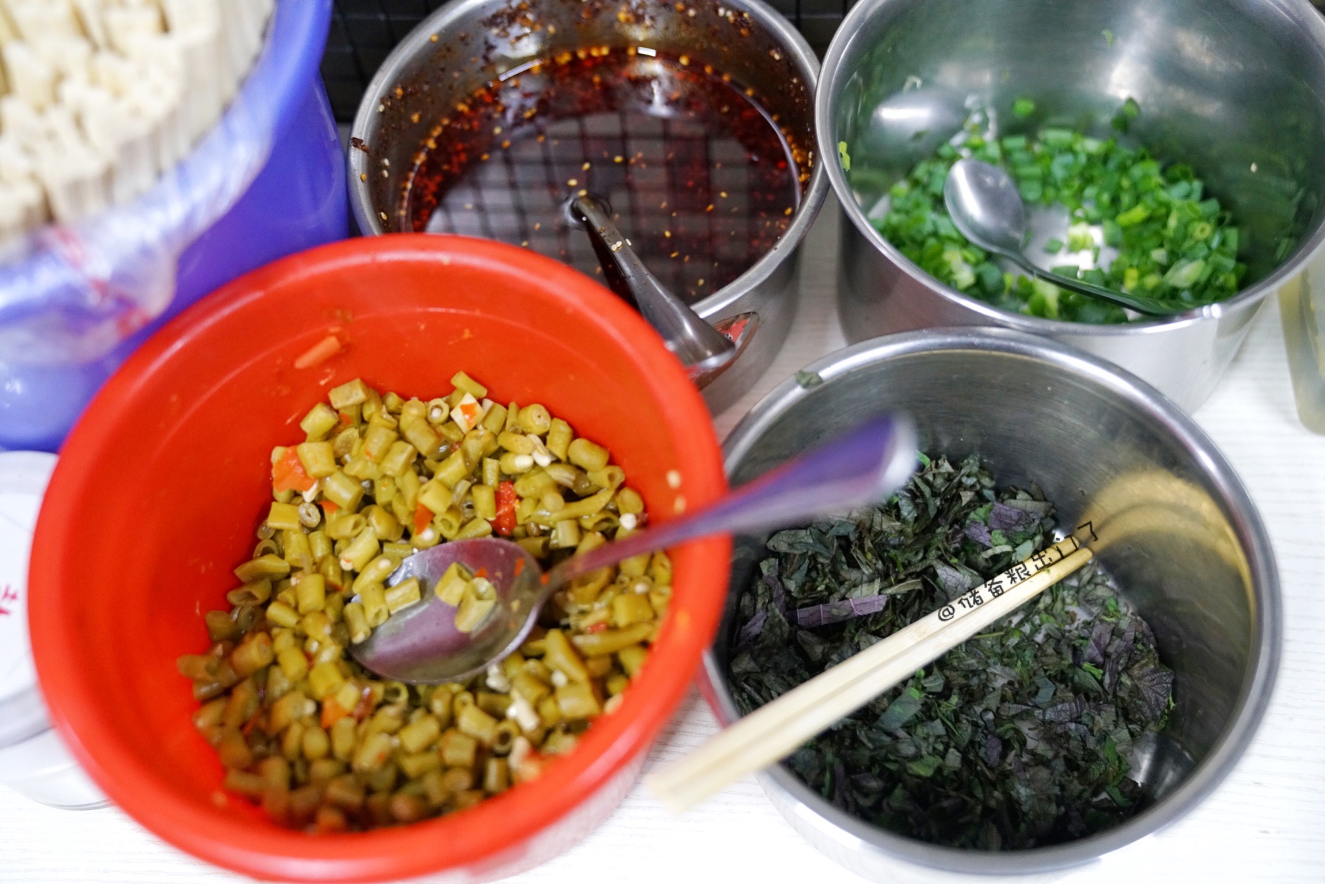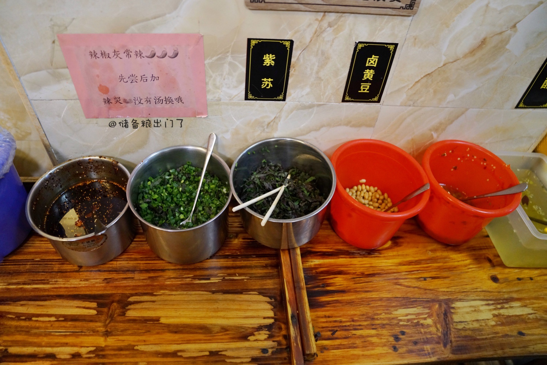 是不是每家螺蛳粉店都有一套自己的配菜哲学?除了卤黄豆、腌豇豆、葱花、辣椒等常见小菜,我在六品坊竟然发现了紫苏!喜欢紫苏味道的多加了两勺,拌在一起吃特别惹味。