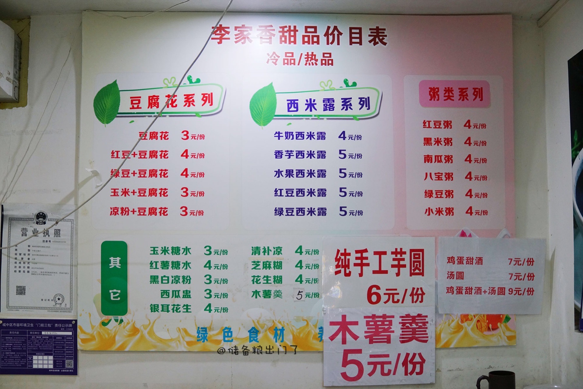 甜豆花3元、芝麻糊4元、西米露4元,这物价敢信吗?只要冰柜里有货,你自己随心所欲瞎点菜单上没有的搭配老板娘也能满足你。