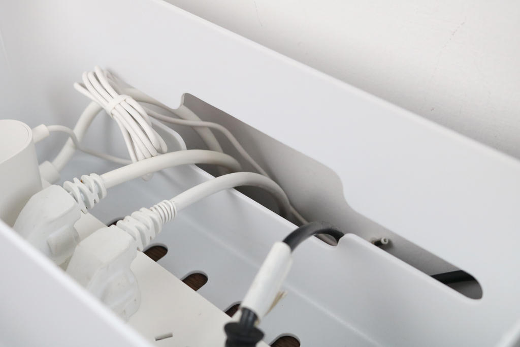 奥睿科这款收纳盒的背部为线束的走线,从正面看是看不到的,隐藏设计也不会影响到桌面的美观。一字扣的设计,我们放三项插孔以及大型的冲线头都可以通过此口穿过,而且多个电源线也是方便我们在后边整理的。