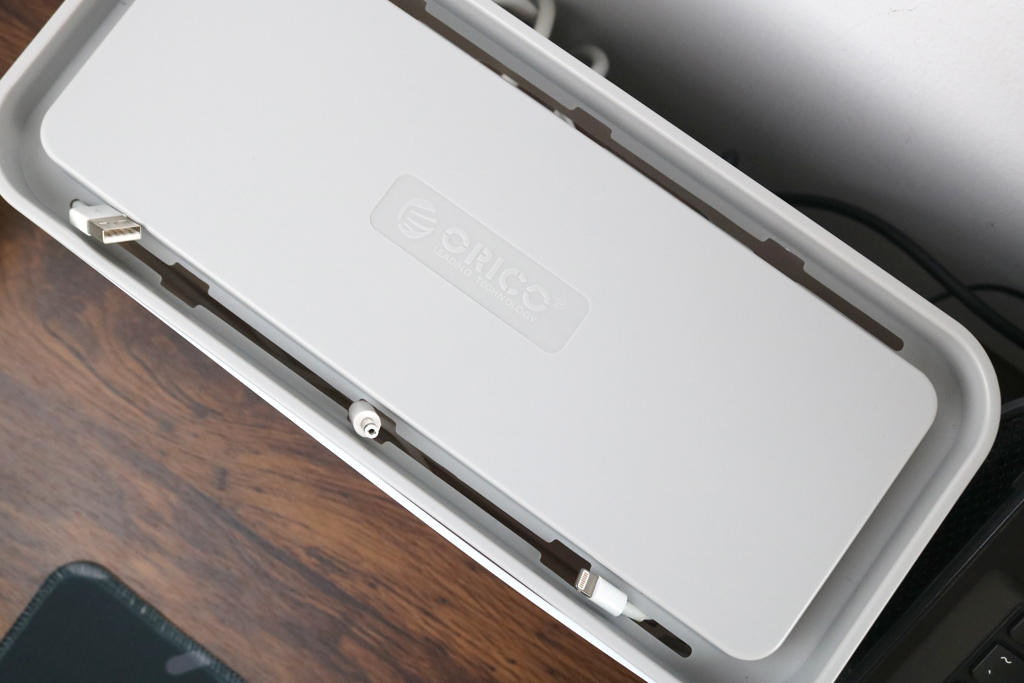 盖子上设计了凹槽级六卡位接口设计设计,可以漏出多个充电线及数据线的使用,我就拿经常使用的苹果数据线头、电源有、USB接口进行拜访测试。这样非常方便在手机、ipad等电子设备边充边玩以及对于线束方向进行控制。