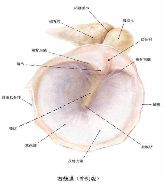 中耳比较复杂,它始于耳道的末端处的鼓膜。鼓膜朝内耳方向呈锥状,半透明,它将中耳腔或鼓室与耳道分隔开。中耳腔的主要部分位于鼓膜和一人骨性壁(骨岬)之间,腔内充满空气并通过咽鼓管与咽部相通。声音由鼓膜的振动传送至内耳。