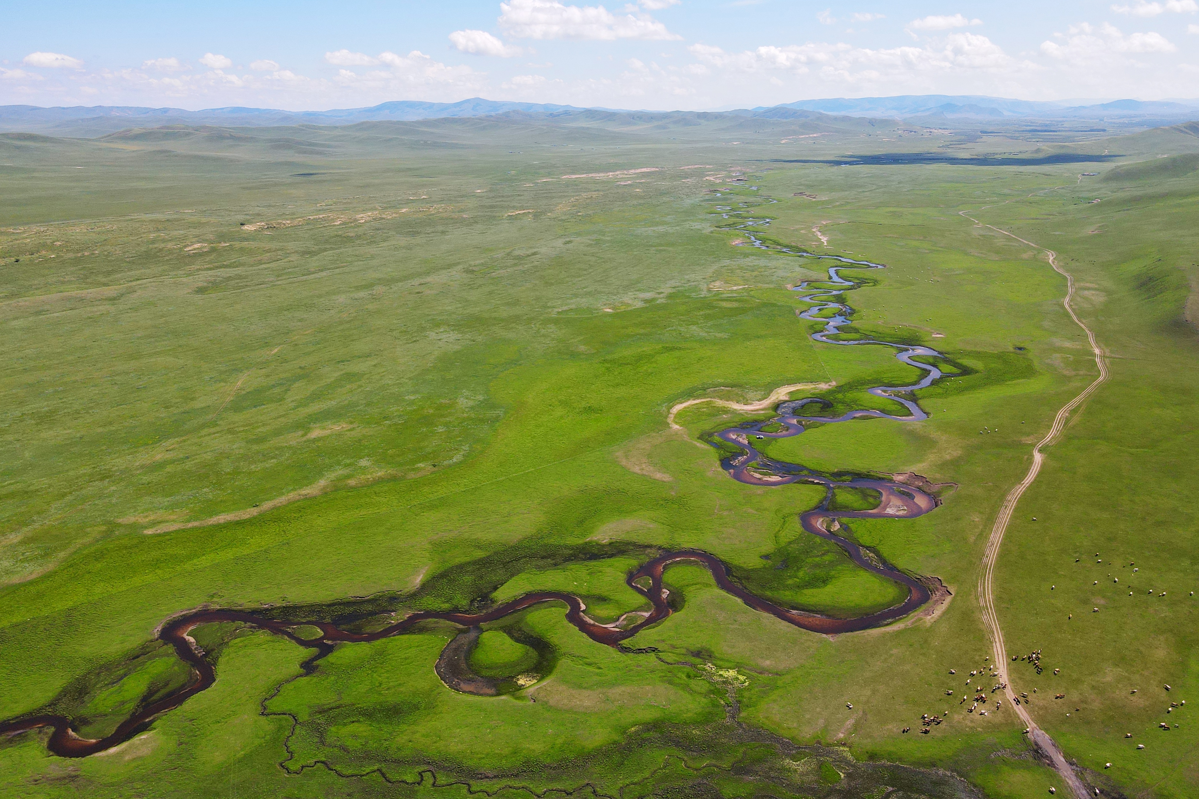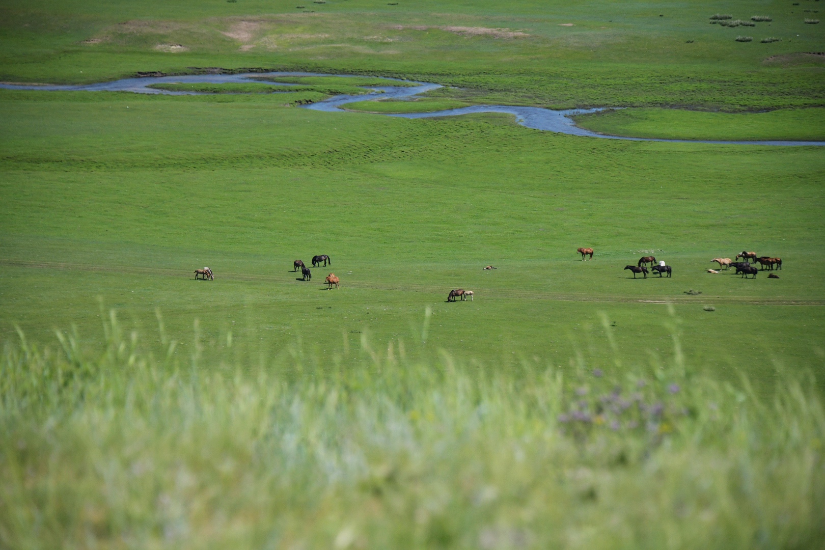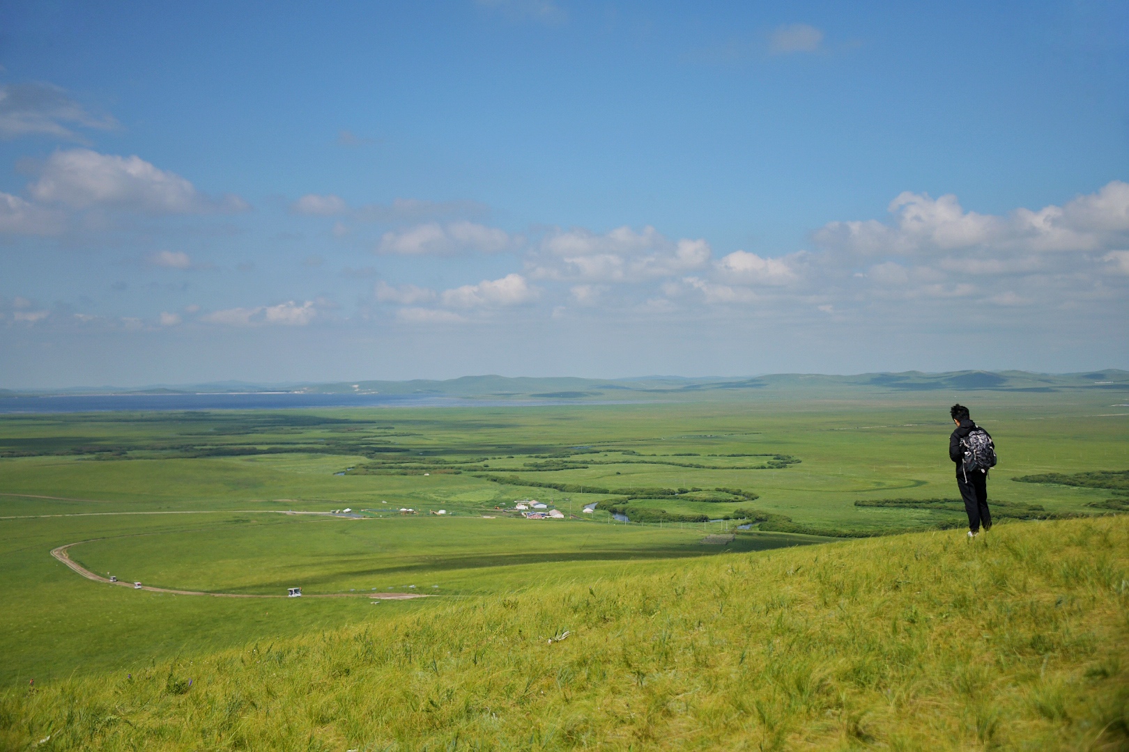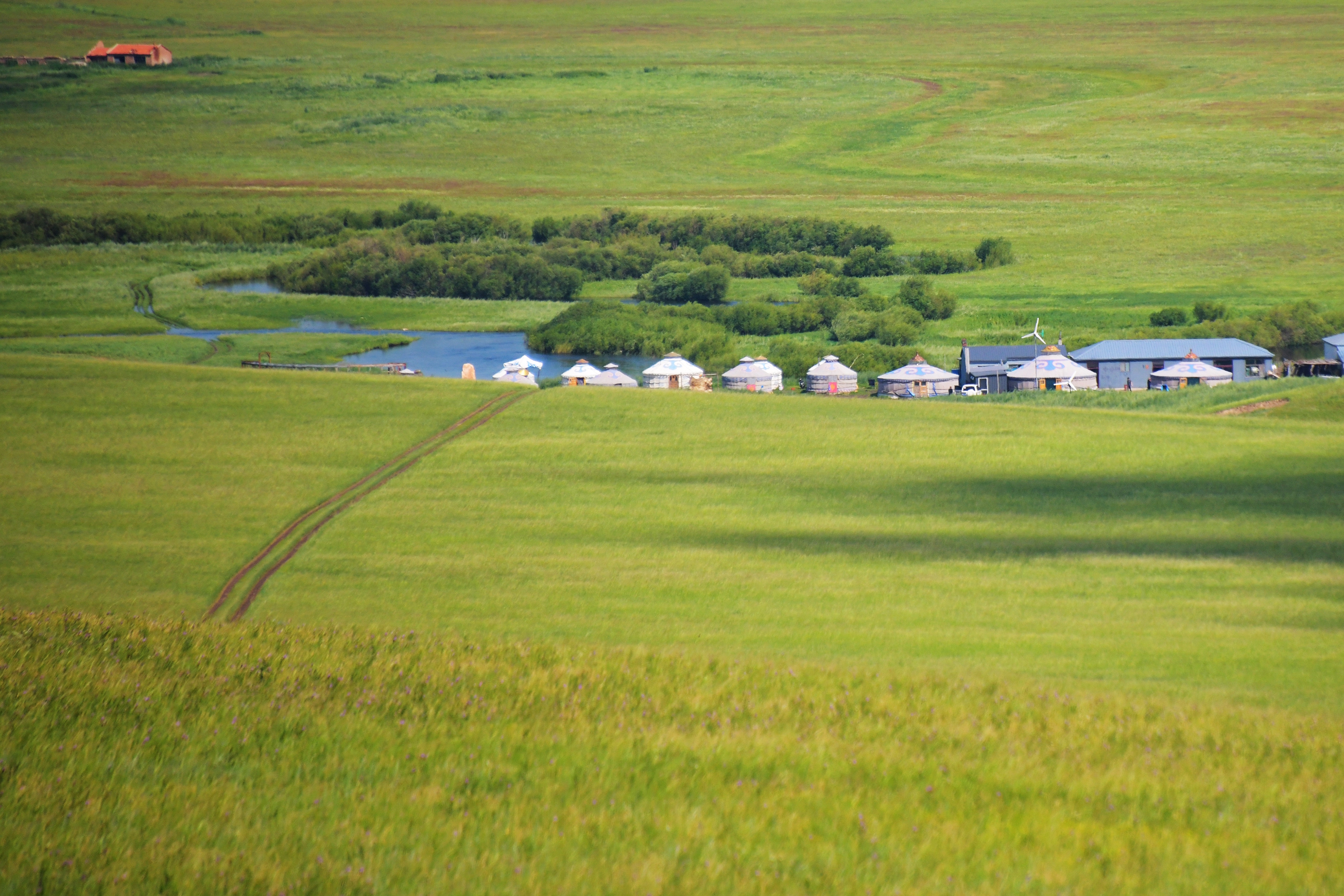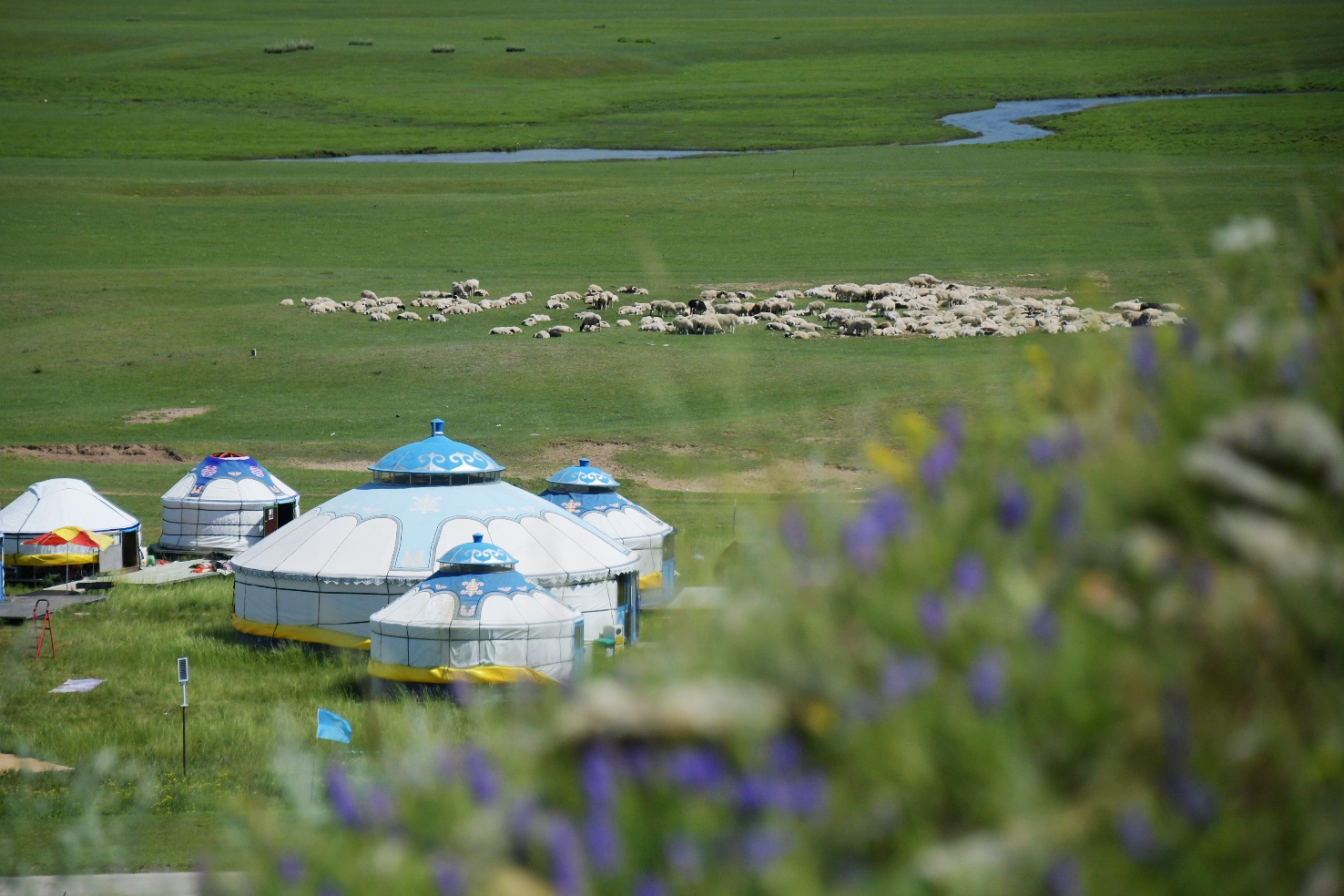游牧部落就在这条最美嘎查环线上,沿开满野花的小路登临山顶,蓝天白云之下,曲流蜿蜒至天边,牛羊马群快乐地啃食着一年最肥美的青草,那风拂过,顿感心旷神怡。