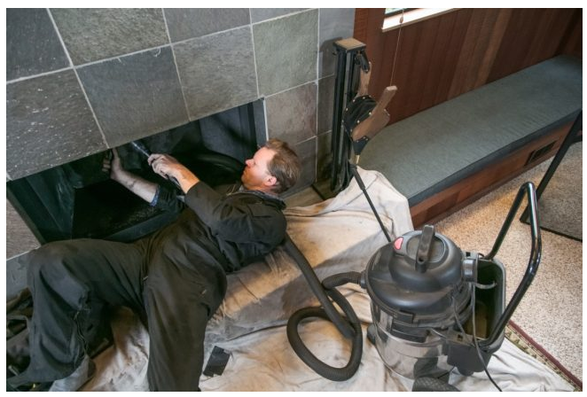 接下来要进行的就是有关壁炉本身的清洗工作了。撕开放置在火箱上方的胶带封条上的一个小开口,使用直径较小的烟囱刷,从开口处伸手,并在刷子可以触及的范围内尽可能地擦洗壁炉烟囱。完成后,再次盖上壁炉,让多余的灰尘落到火箱的地板上。学习如何清洁烟囱——并自己完成这项工作——意味着在经济方面能够为你每年省下一大笔开支,而在精神层面,更能让你体会到劳动不易,同志努力的真谛。
