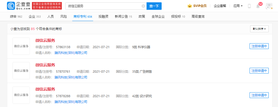 IT之家 7 月 27 日消息 信息显示,近日,腾讯科技(深圳)有限公司申请注册多项“微信云服务”“WECHAT CLOUD”商标,国际分类含科学仪器、广告销售、设计研究等,当前商标状态均为注册申请中。