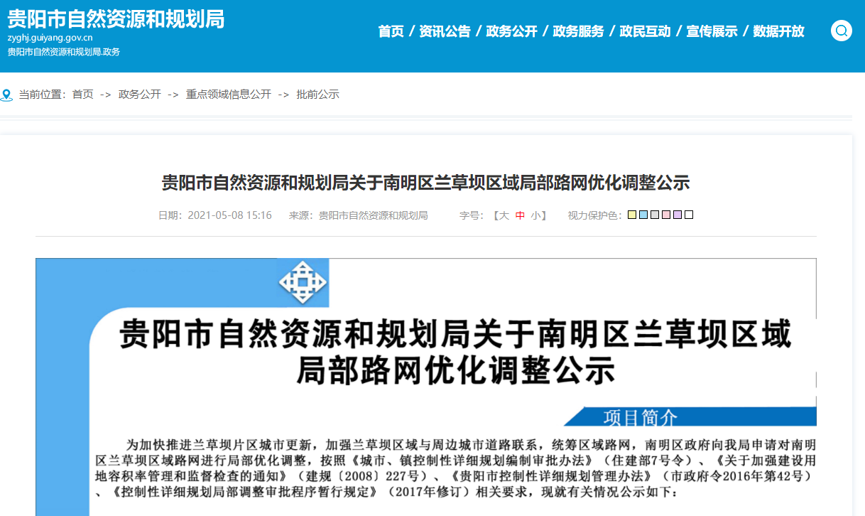 此外,在今年5月份,贵阳市自然资源和规划局还发布了关于南明区兰草坝区域局部路网优化调整公示。从公示图可以看出,未来该区域内会由多条道路贯通,连接甲秀南路、车水路等去往其他区域的主干道。